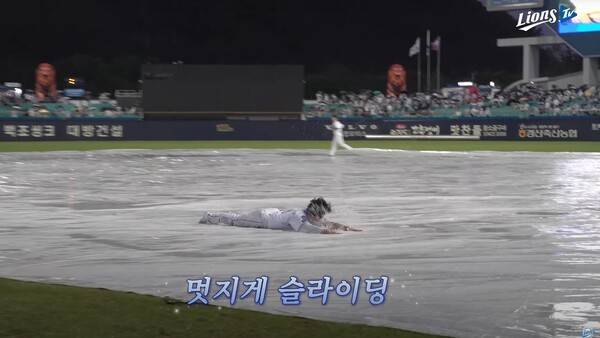 홈팀 삼성 선수단은 경기가 취소되자 익숙한 듯 더그아웃 앞에 모여 '우천 취소 세리머니'를 펼쳤다. 삼성 이재현, 김영웅, 양도근이 방수포 위에서 슬라이딩을 펼치는 세리머니를 선보이며 아쉬움을 달랬다.