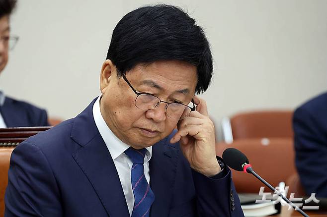 최교진 사회부총리 겸 교육부장관 후보자가 2일 서울 여의도 국회에서 열린 교육위원회 인사청문회에서 손으로 얼굴을 만지고 있다. 최 후보자는 이날 인사청문회에서 천안함 폭침 사건 음모론 동조 의혹과 음주운전 이력, 부산 비하 발언 등과 관련해 거듭 사과했다. 윤창원 기자