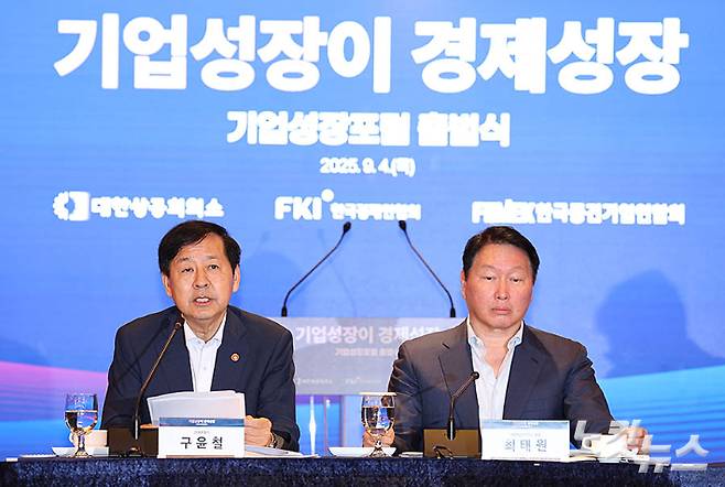 구윤철 경제부총리 겸 기획재정부 장관이 4일 오전 서울 중구 롯데호텔에서 대한상의·한국경제인협회·한국중견기업연합회가 연 기업성장포럼 출범식에 참석해 인사말을 하고 있다. 최태원 대한상공회의소 회장은 이날 기조연설을 통해 "규제의 벽을 제거해야 성장 모멘텀이 계속 일어날 수 있다"며 "기업 사이즈별 규제를 풀지 않으면 경제성장은 일어나지 않을 것"이라고 말했다. 류영주 기자