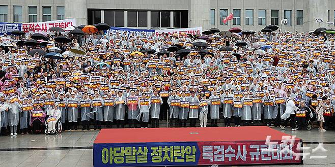 국민의힘은 조은석 내란특별검사팀의 원내대표실·원내행정실 압수수색 시도가 사흘째 이어진 4일 서울 여의도 국회 본청 앞 계단에서 열린 야당말살 정치탄압 특검수사 규탄대회에서 국민의힘 장동혁 대표와 의원 및 당원들이 구호를 외치고 있다. 장동혁 대표는 "모래 위에 쌓아 올린 정치 특검의 수사는 결국 이재명 정권의 목을 베는 칼날이 될 것"이라며 "이재명 정권을 무너뜨리기 위해서 목숨 걸고 진격해야 한다"고 강조했다. 윤창원 기자