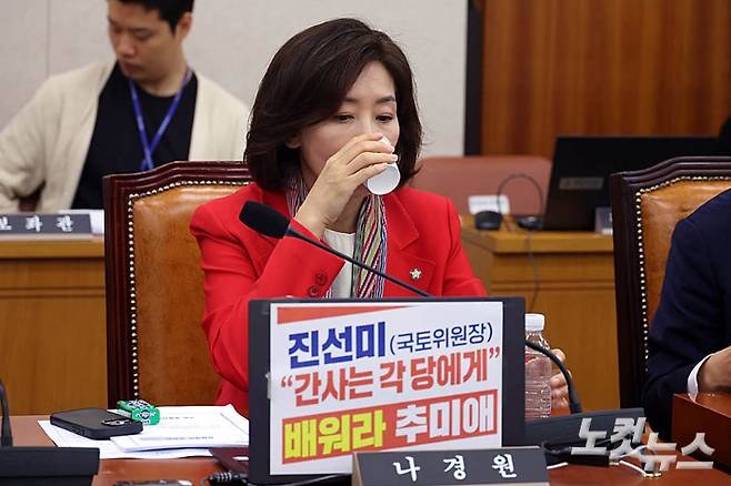 4일 서울 여의도 국회에서 열린 법제사법위원회 전체회의 '검찰개혁 공청회'에서 국민의힘 나경원 의원이 물을 마시고 있다. 더불어민주당 소속 추미애 국회 법제사법위원장은 이날 오후 법사위 전체회의가 시작하자마자 나 의원에게 '초선은 가만히 있으라' 발언에 대한 사과 의향을 물었다. 나 의원은 추 위원장이 자신을 야당 간사로 선임하는 안건을 법사위에 상정하지 않는 것을 비판하며 사과하지 않았다. 윤창원 기자