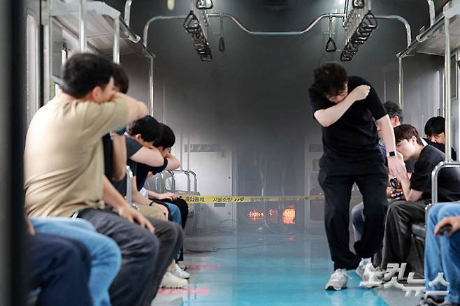 서울교통공사가 4일 경기 고양시 지축차량기지에서 서울소방재난본부와 합동으로 전동차 객실과 실내 설비품 6종에 대한 화재 시연을 하고 있다. 서울교통공사는 실제 화재 상황을 가정해 전동차 내장재의 화재 안전성을 점검했다. 지난 5월 5호선 방화 사건 이후 승객 안전을 강화하기 위한 조치다. 류영주 기자