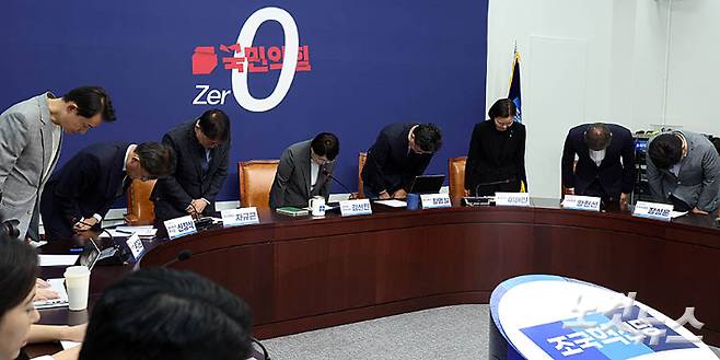 조국혁신당 김선민 대표 권한대행와 지도부가 5일 서울 여의도 국회에서 열린 현안 관련 기자간담회에서 당내 성비위 및 직장 내 괴롭힘 사건과 관련 사과를 하고 있다. 조 권한대행은 "강미정 대변인을 포함한 피해자 여러분께 위로 말씀을 드린다"며 "다시 한번 사죄의 말씀을 드린다"고 말했다. 전날 강미정 대변인은 국회 소통관에서 기자회견을 열고 당내 성 비위 사건 처리 과정에 대한 문제를 제기하며 탈당을 선언했다. 윤창원 기자
