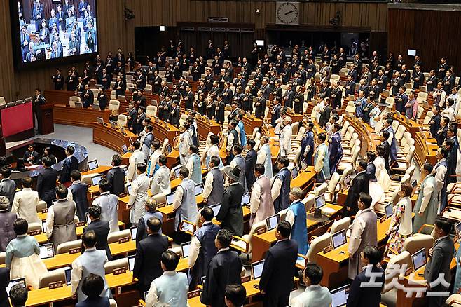 1일 서울 여의도 국회에서 열린 제429회 국회(정기회) 개회식에 한복을 입은 더불어민주당 의원들과 검은 정장과 근조리본을 착용한 국민의힘 의원들이 국민의례를 하고 있다. 윤창원 기자