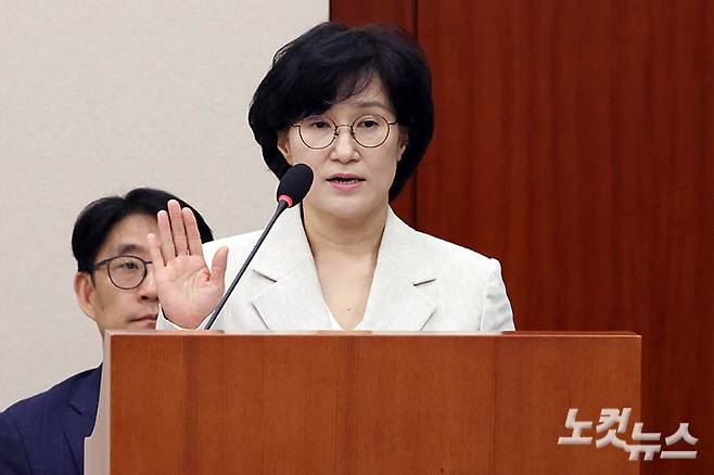 원민경 여성가족부 장관 후보자가 3일 서울 여의도 국회 여성가족위원회에서 열린 인사청문회에서 선서를 하고 있다. 여야는 이날 인사청문회에서 증인·참고인 채택 무산을 두고 공방을 벌였다. 윤미향 전 의원 증인 채택 문제에 더해 '피해 호소인' 용어 사용 논란까지 겹치며 확전됐다. 윤창원 기자