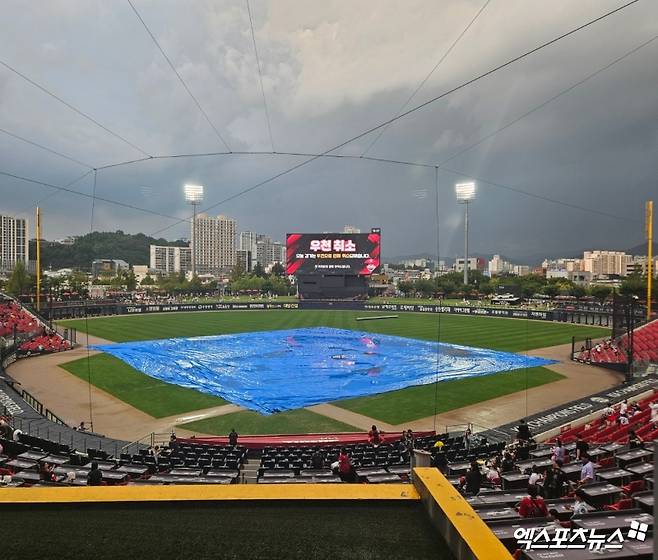 이날 홈팀 KIA에 이어 원정팀 KT까지 경기 전 훈련을 정상적으로 소화했다. 그런데 변수가 발생했다. 오후 5시 25분께 비가 내리기 시작했고, 시간이 지날수록 비의 양은 점점 많아졌다. 그라운드에는 대형 방수포가 설치됐다. 짧은 시간 동안 많은 비가 내리면서 그라운드 곳곳에는 물웅덩이가 생겼다.