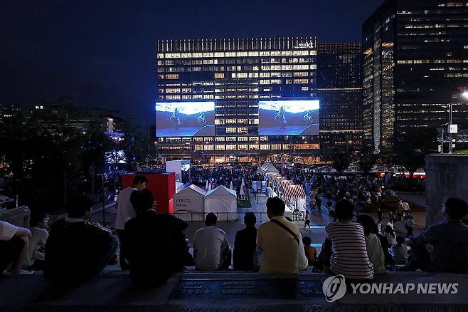 (서울=연합뉴스) 류영석 기자 = 5일 서울 광화문광장에서 열린 광화문스퀘어 오프닝 세리머니에서 KT WEST 빌딩에 설치된 대형 전광판에 공연 영상이 재생되고 있다. 2025.9.5