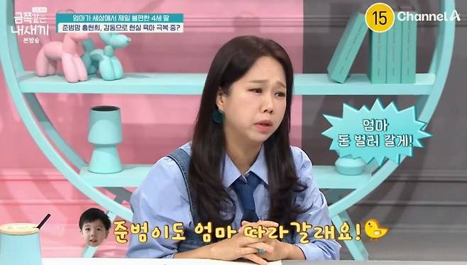 이날 신애라는 홍현희에게 "얼마 전에 아들 준범이한테 감동했다던데"라고 물었고, 홍현희는 "얼마 전이 아니라 오늘 아침에도"라며 사연을 전했다. 홍현희는 "제가 돈 벌러 간다고 하니까 자기도 돈 벌러 간다고 하더라. 힘들어서 안 된다고 하니까 자기가 힘든 엄마 옆에 있어 주고 싶다고 했다"라고 말해 감동을 안겼다. 장영란은 "말을 어쩜 그렇게 예쁘게 하냐. 현희 씨 안 닮았나 보다"라고 농담하기도.