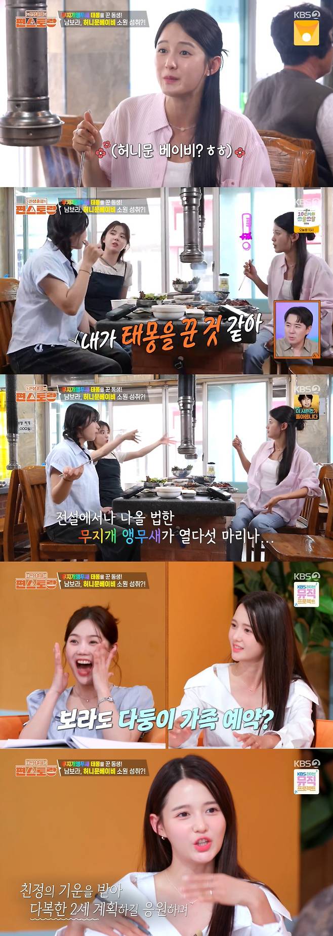 남보라는 결혼 후 애써준 동생들을 위해 함께 포상 여행을 떠났다. 남보라 가족은 김천의 맛집에서 식사를 하던 중 남보라의 2세 이야기를 꺼냈다. 남보라 동생은 남보라에게 "2세 준비한다고 했는데 신혼여행에서 허니문 베이비 있었어?"라고 물었고 남보라는 수줍게 웃었다. 이어 동생은 "최근에 태몽을 꿨다"라고 말해 남보라를 놀라게 했다. 동생은 "원래 꿈을 안 꾸는데 무지개 앵무새 열댓 마리가 나한테 날라왔다. 전설에나 나올 법했다. 되게 컸다"라며 구체적으로 말했다.