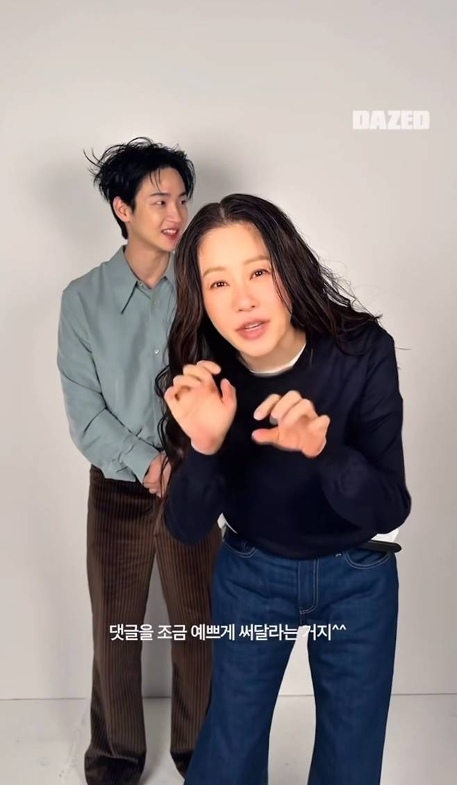 영상 속 고현정은 장동윤과 나란히 서서 최근 틱톡에서 유행 중인 "댓글 예쁘게 써달라" 밈을 재현했다.