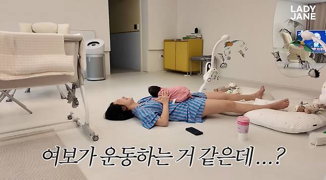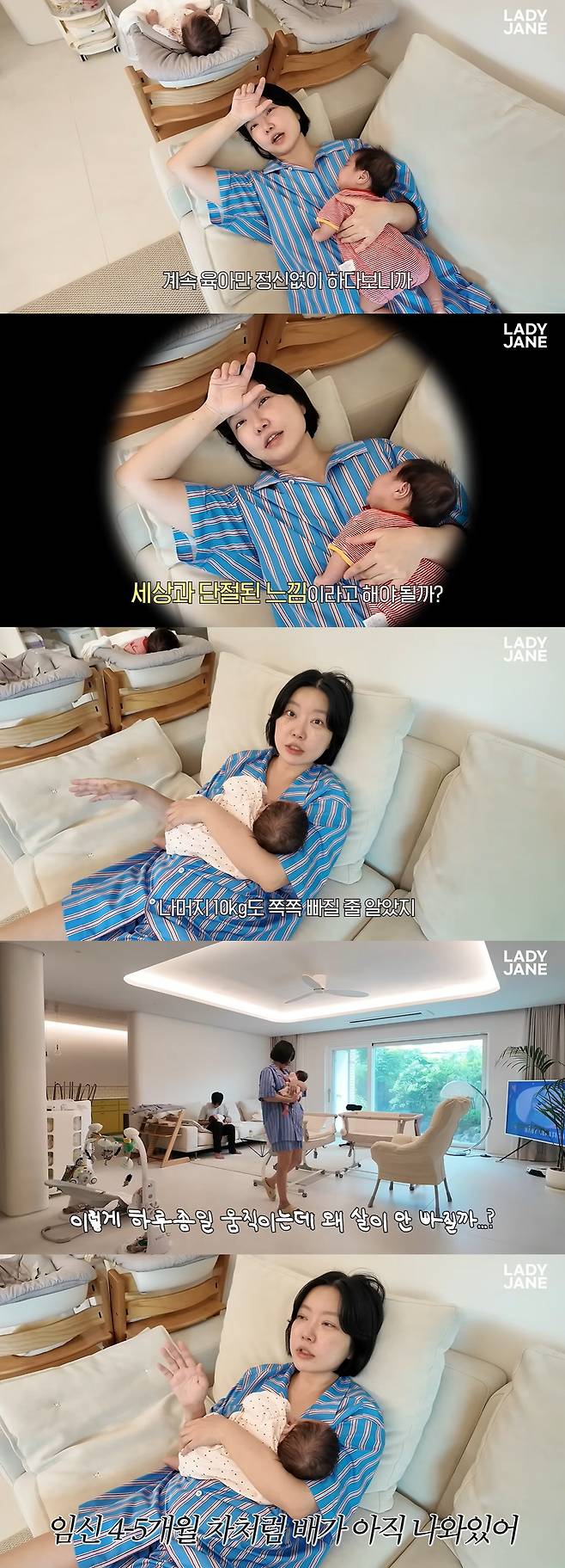 또 레이디제인은 "또 슬픈 게 있다. 배가 안 들어간다"라며 산후 다이어트 고충도 토로했다. 레이디제인은 "조리원에서 10kg가 빠져서, 조리원에서 나오면 나머지 10kg도 빠질 줄 알았는데 하나도 안 빠진다. 임신 4, 5개월 차 배처럼 아직 나와있다. 하루 종일 집에서 힘들게 움직여도 그건 노동이지 운동은 아닌 거다"라며 허탈해했다.