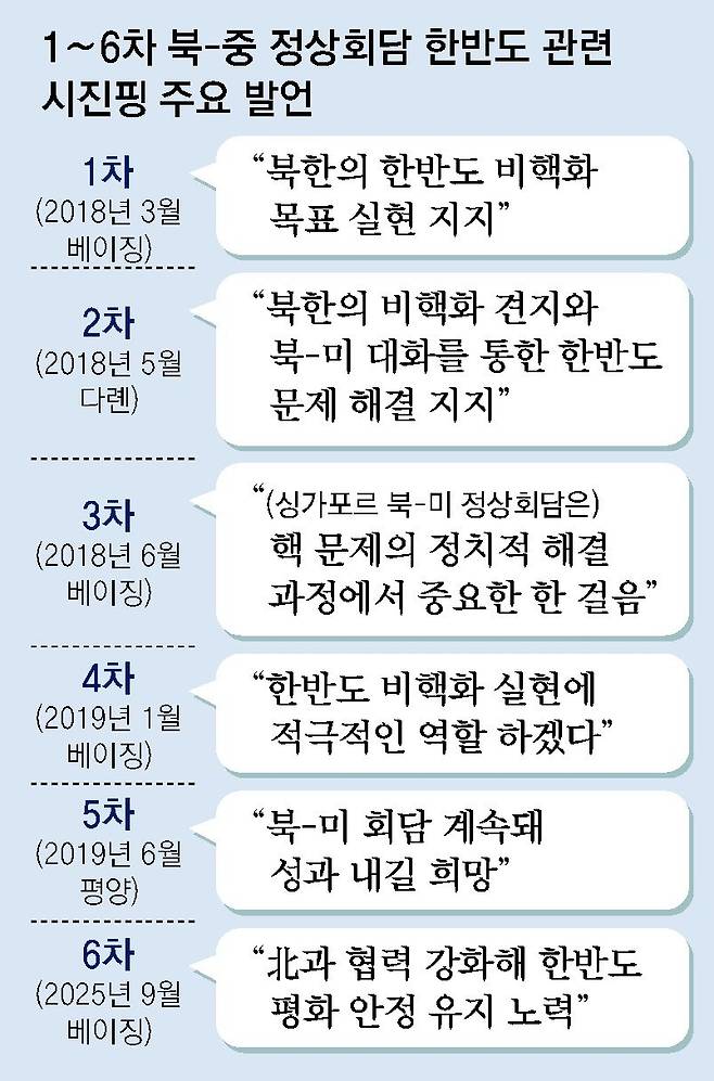 그 대신 시 주석은 북-중 정상회담에서 “조선(북한)과 협력을 강화해 한반도의 평화와 안정을 유지하기 위해 노력할 의향이 있다”고만 했다. 북한이 비핵화 불가론을 거듭 강조하고 있는 가운데 북-중 공조를 강화하겠다는 것.