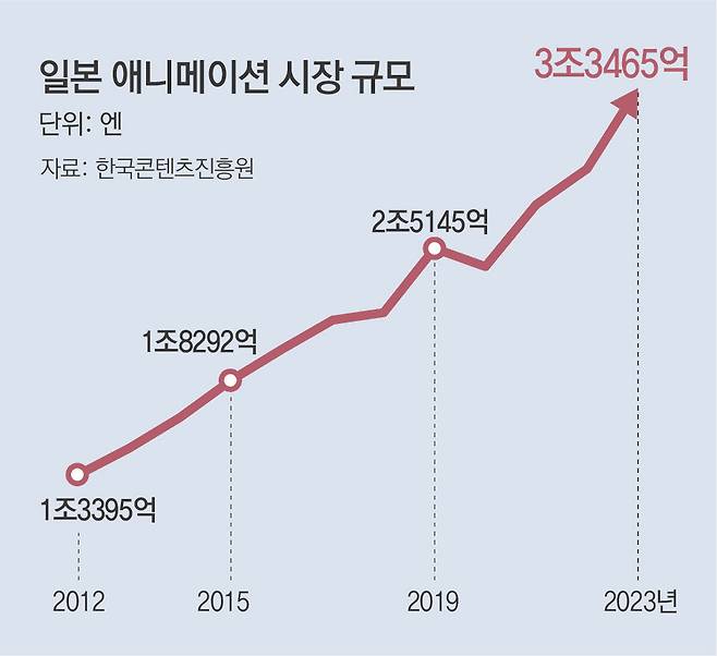 산업 규모도 성장세다. 한국콘텐츠진흥원의 ‘일본 애니메이션 산업 동향’에 따르면 2023년 일본 애니메이션 시장 규모는 3조3465억 엔(약 30조5177억 원)으로 2022년보다 14.3% 증가했다. 특히 주목할 대목은 과거 ‘내수용’이라 평가받던 일본 애니메이션이 이젠 자국 시장(1조6243억 엔)보다 해외 시장(1조7222억 엔) 규모가 더 커졌단 점이다.