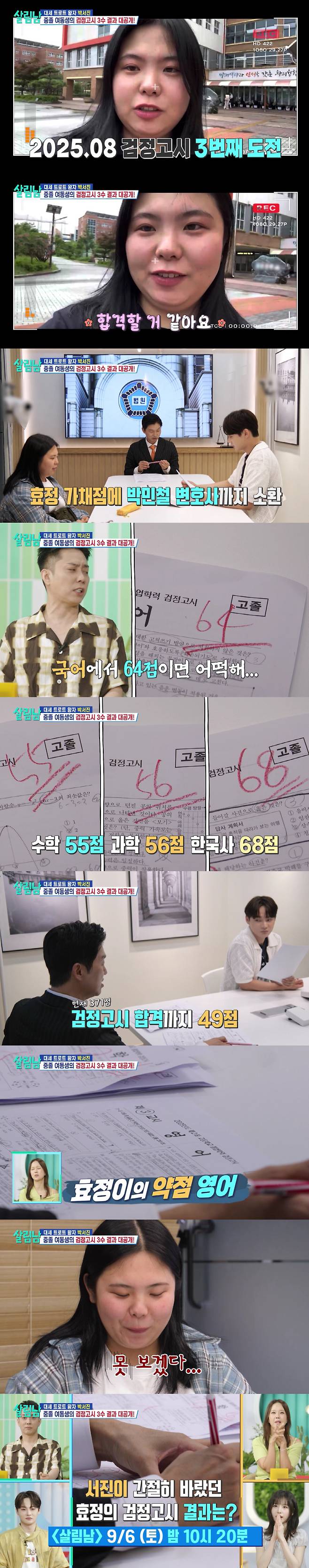 과연 박효정은 세 번째 도전에서 합격의 기쁨을 안게 될까. 박서진이 간절히 바랐던 효정의 검정고시 결과는 오늘(6일) 밤 10시 20분 KBS2 '살림하는 남자들 시즌2'를 통해 공개된다.