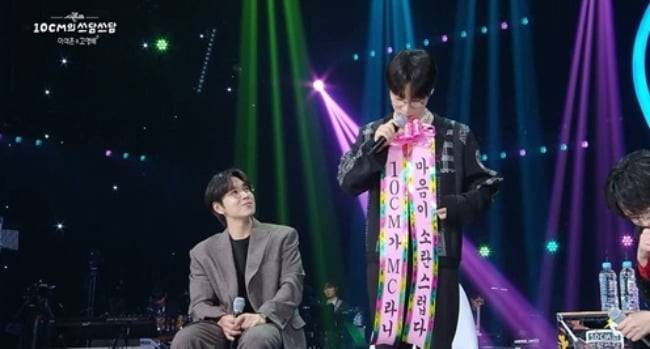 가요계의 대표 ‘안경좌’이자 십센치의 절친 이석훈은 신곡 ‘어른이 됐고’를 부르며 촉촉한 감성을 선사했다. 무대 후 신곡 토크를 이어가던 중 또 다른 절친 고영배가 ‘10CM가 MC라니 마음이 소란스럽다’는 문구가 적힌 띠를 두르고 인간 화환으로 등장했다. 고영배는 과거 ‘이영지의 레인보우’에 십센치와 함께 출연해 동반 MC로 의지를 드러냈던 것과 달리 십센치가 단독 MC를 맡은 것에 대해 “마음이 소란스럽다”며 웃픈 축하를 건네 웃음을 자아냈다.