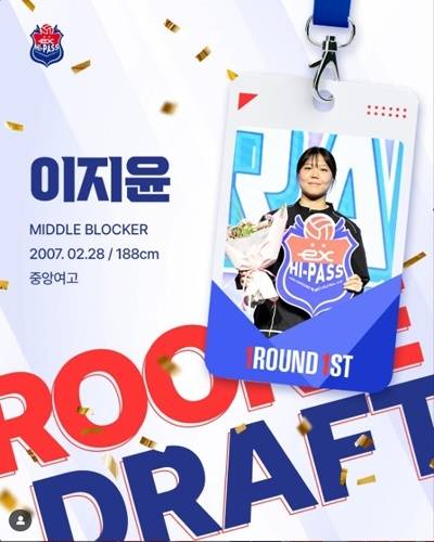 한국도로공사 하이패스 구단은 5일 서울 강서구 메이필드 호텔에서 열린 2025-2026 한국배구연맹 V리그 여자부 신인 드래프트에서 전체 1순위 지명권을 얻어 188cm의 신장을 가진 중앙여고의 미들블로커 이지윤을 지명했다. 이로써 도로공사는 2023년 미들블로커 김세빈, 작년 세터 김다은에 이어 3년 연속 전체 1순위 지명권을 행사하며 미들블로커의 선수층을 강화하는데 성공했다.