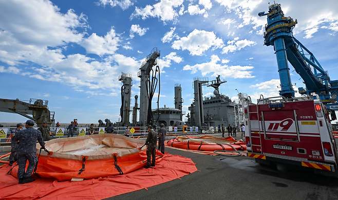 제주 해군기동함대사령부 소속 대청함은 국방부의 지원 지시에 따라 지난 4일 해군 1함대 동해군항에 입항해 청수(깨끗한 물)를 채웠습니다.