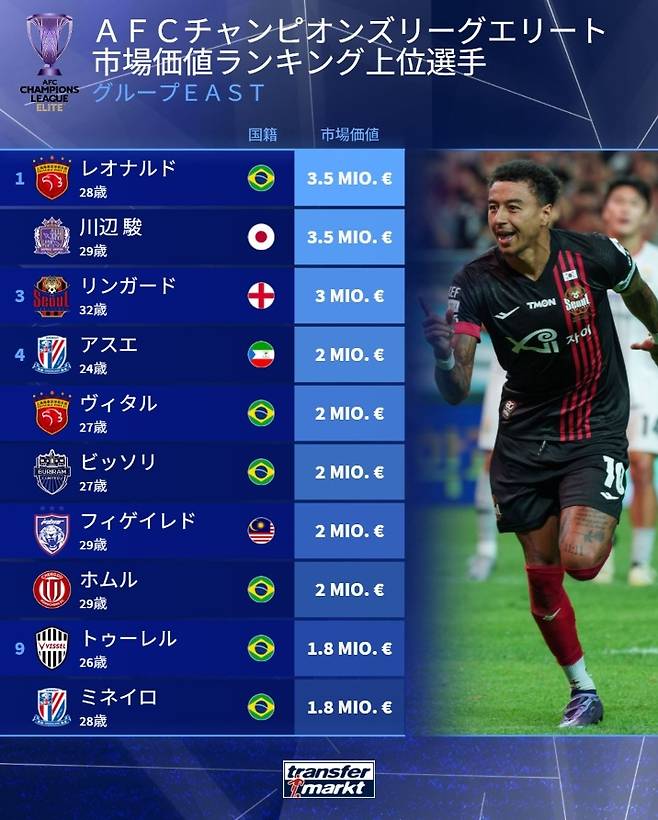 린가드가 레오나르도와 가와베의 뒤를 이었다. '트란스퍼마크트'에서 평가한 린가드의 가치는 300만 유로(약 49억원)로, 맨유에서 뛰던 시절을 생각하면 많이 낮아진 금액이지만 여전히 K리그에서는 최고 수준이다. 린가드는 이번 ACLE에 참가하는 K리그 3개팀 선수들 중 유일하게 해당 명단에 이름을 올리며 K리그의 자존심을 지켰다.