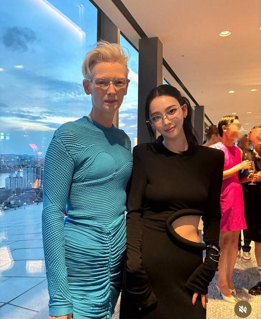 에스파 카리나, 옆트임 드레스로 핫한 분위기···틸다 스윈튼과 투 샷