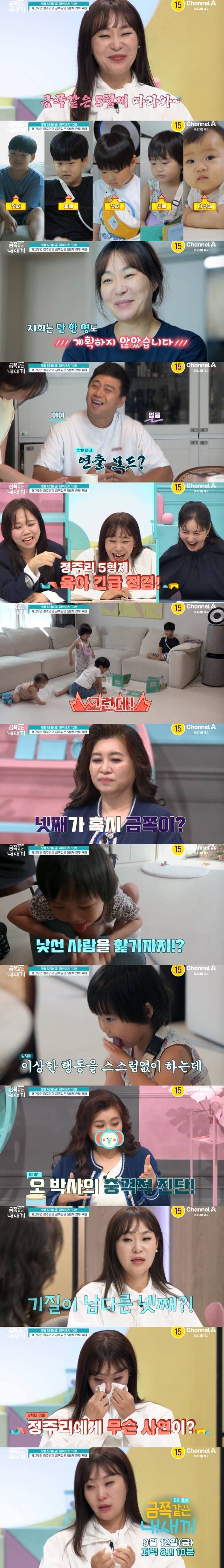 5일 공개된 채널A '요즘 육아-금쪽같은 내새끼' 예고편에는 오형제 맘 정주리가 출연했다.