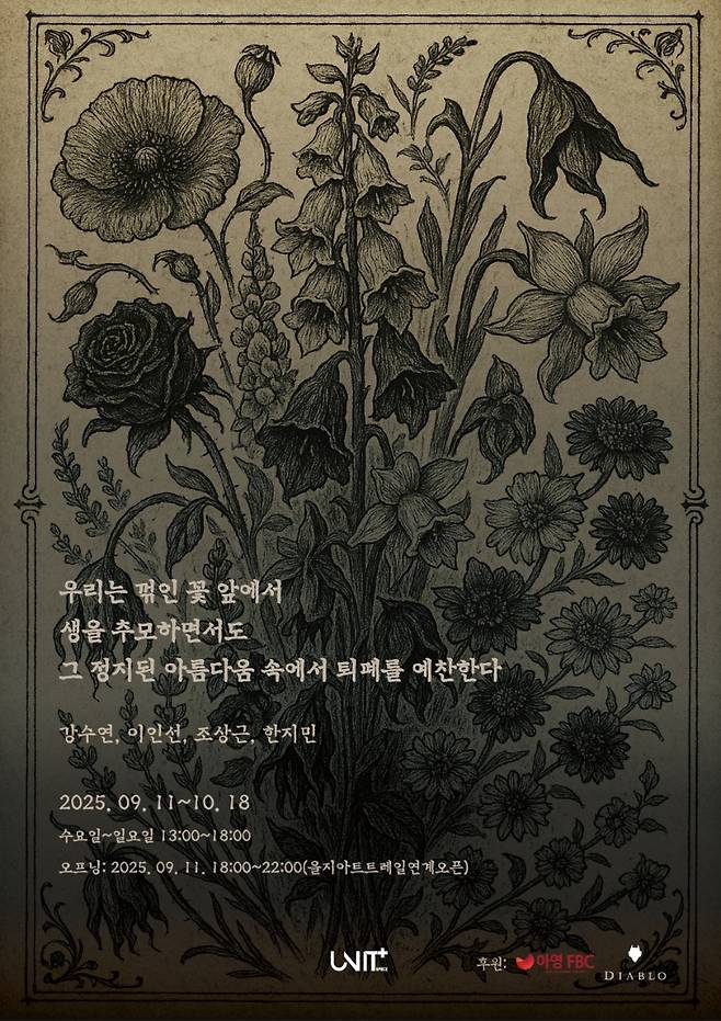 스페이스유닛플러스의 기획전 ‘우리는 꺾인 꽃 앞에서 생을 추모하면서도, 그 정지된 아름다움 속에서 퇴폐를 예찬한다’는 바로 이 현대적 바니타스를 실험합니다.