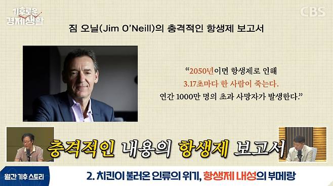 ◇ 남종영> 그렇죠. 지금 항생제 내성이 올라가고 있기 때문에 전 세계적인 보건에 문제가 되고 있는데요. 2016년 5월에 한 보고서가 세상에 공개됐는데 영국 정부하고 웰컴트러스트가 후원한 보고서였어요. 항생제에 대해서 실태를 밝힌 보고서였는데 2050년 정도 되면 항생제로 인해서 3초마다 한 사람씩 죽게 되고 연간 1000만 명의 초과사망자가 발생한다는 충격적인 결과였죠. 통계와 추정 정도로는 현재 연간 70만 명 정도의 항생제로 인한 초과사망자가 있거든요. 그런데 이게 1000만 명까지 급격하게 불어난다고 이야기한 거죠.