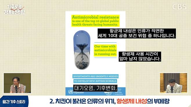 ◇ 남종영> 네. 그래서 2019년 세계보건기구가 항생제 내성을 세계 10대 공중보건 위협의 하나로 발표했습니다. 대기 오염, 기후 변화, 유행성 독감, 가뭄, 기아, 전쟁 이런 것과 같은 반열에 항생제 내성을 추가한 거죠.