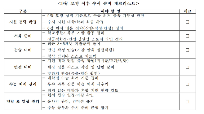 우선 필요한 것은 9월 모의평가 성적 분석이다. 유웨이교육평가연구소는 “단순히 등급만 보는 것이 아니라, 과목별·영역별 취약 단원을 세부적으로 확인해야 한다”고 조언했다.