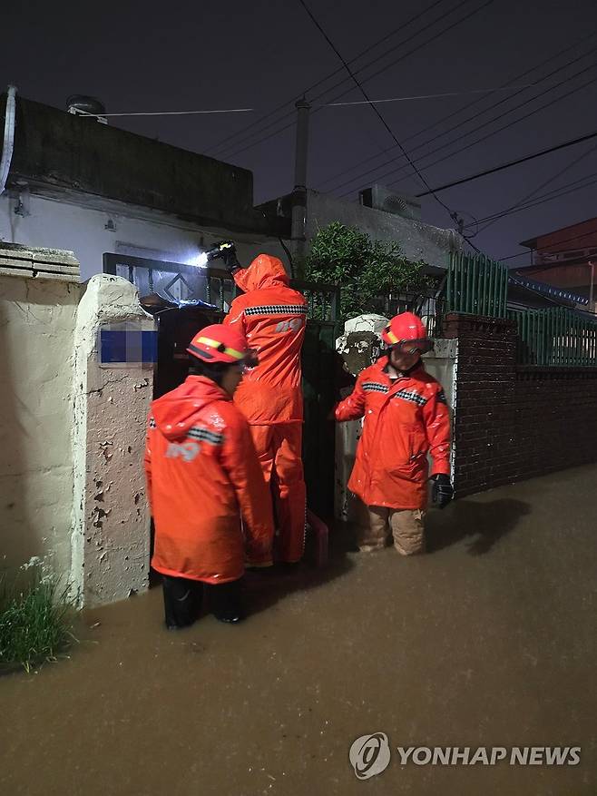 (군산=연합뉴스) 전북지역에 집중호우가 쏟아진 7일 군산시 송풍동에서 소방당국이 주민들을 대피시키고 있다. 2025.9.7 [전북특별자치도소방본부 제공. 재판매 및 DB 금지]