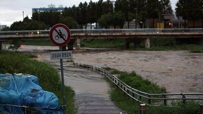▲ 7일 호우 특보가 내려진 전북 전주시 전주천 쌍다리 주변 산책로가 물에 잠겨 있다.