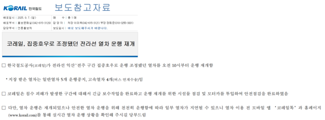 열차 운행은 재개됐으나 승객 안전을 위해 일부 구간 서행으로 열차가 지연될 수도 있다고 코레일은 전했다. 코레일 관계자는 “열차 이용 전 모바일앱인 코레일톡과 홈페이지를 통해 실시간 열차 운행 상황을 확인해달라”고 당부했다.
