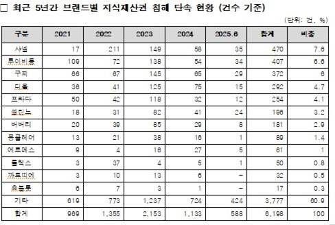 브랜드별로, 적발 건수에서는 샤넬이 470건으로 가장 많았다. 이어 루이비통 407건, 구찌 372건, 디올 292건, 프라다 254건 순이었습니다.