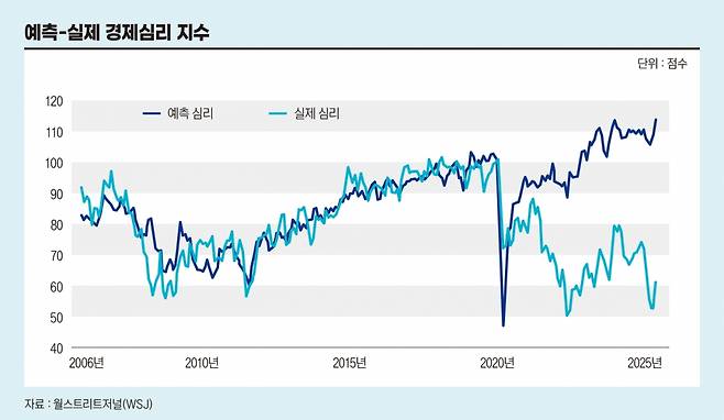 WSJ 조사에서도 이러한 양상이 드러났다. 고용·물가·주식 등 주요 지표를 종합한 회귀모형은 경제심리가 개선될 것이라고 예측했지만 실제 소비자심리지수는 급락해 양자 간 격차가 역대 최대 수준으로 벌어졌다. 닐 머허니 스탠퍼드대 경제학 교수는 “미국의 강점 중 하나는 끊임없는 낙관주의”라며 “그 강점이 사라지고 있는 것 같아 안타깝다”고 말했다.