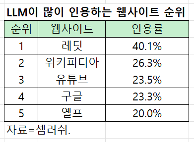 정보분석업체 셈러쉬가 지난 6월 챗GPT, 퍼플렉시티, 구글 인공지능(AI모드·AI오버뷰) 등을 조사한 결과 LLM이 가장 많이 인용하는 웹사이트는 레딧이었다.