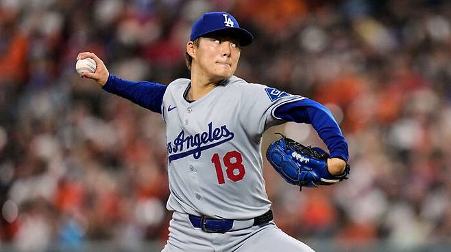 ▲ 다저스의 일본인 투수 야마모토가 7일 미국 메릴랜드주 볼티모어 오리올파크 앳 캠던 야즈에서 열린 볼티모어와 방문 경기에 선발 등판해 역투하고 있다.