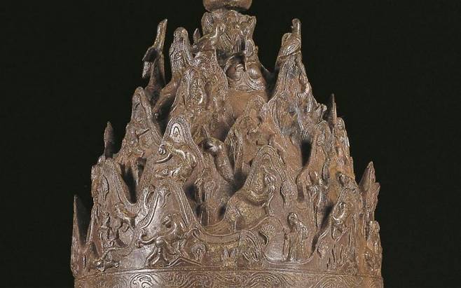 | ▲ 향로의 뚜껑. 23개의 산들이 첩첩산중을 이루고 5인의 악사가 피리, 소금, 비파, 북, 거문고를 연주하며 각종 동물들과 조화를 이루고 있다 |