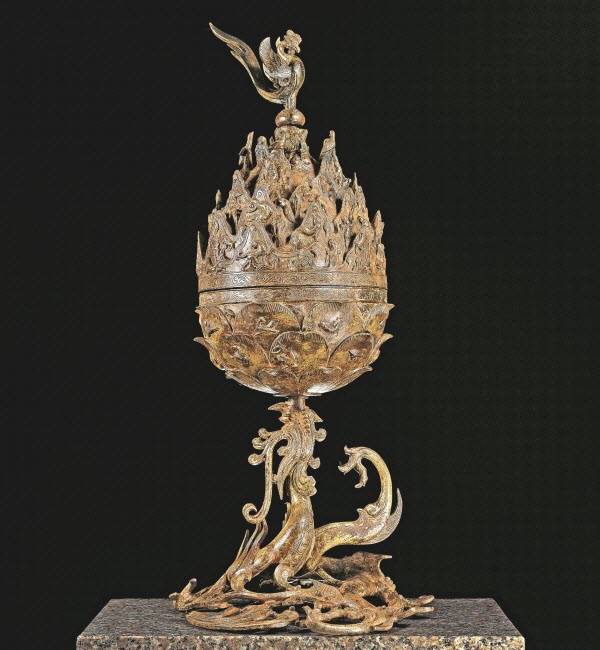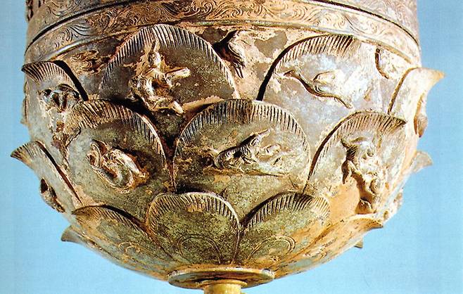 | ▲ 몸체는 활짝 피어난 연꽃을 연상시킨다. 연잎의 표면에는 불사조와 물고기, 사슴, 학 등 26마리의 동물이 배치되어 있다 |