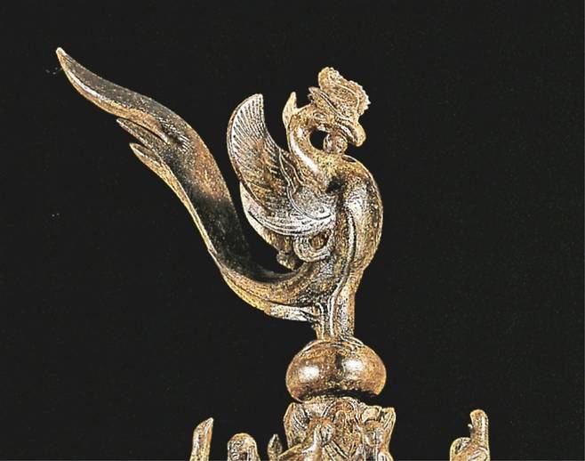 | ▲ 손잡이 부분. 봉황이 여의주를 목에 끼고 산아래 세상을 관조하고 있다 |
