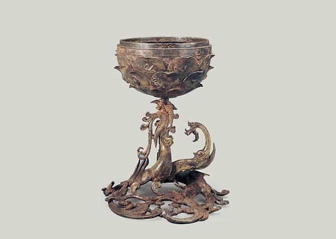 | ▲ 백제금동향로 받침대. 용 한 마리가 고개를 들고 연꽃이 새겨진 몸통을 수직으로 떠 받치고 있다 |