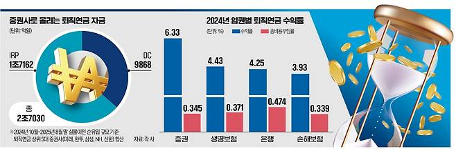 증권사의 퇴직연금 수익률이 높고 수수료가 낮은 게 자금이 옮겨가는 배경으로 꼽힌다. 고용노동부가 업권별로 지난해 퇴직연금 수익률을 집계한 결과 증권사 평균 수익률이 6.33%로 가장 높았다. 생명보험(4.43%) 은행(4.25%) 손해보험(3.93%) 등이 뒤를 이었다. 투자자가 부담해야 하는 총비용은 손해보험(연 0.339%) 업권이 제일 낮았고, 증권(연 0.345%) 생명보험(연 0.371%) 은행(연 0.474%) 순으로 높아졌다.
