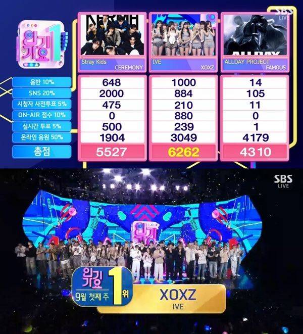 아이브의 'XOXOZ'는 총점 6262점으로 1위를 차지했다. 아이브는 1위에 호명되자 환호하며 기쁨을 나눴다.
