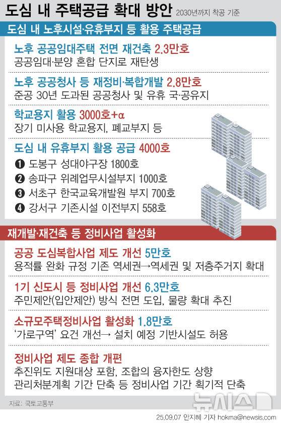 [서울=뉴시스] 정부가 서울의 준공 30년 이상 노후 영구임대 등 공공임대주택을 추가 용적률을 최대 500%까지 확보하는 고밀 개발 방식으로 재건축해 2030년까지 수도권에 2만3000호를, 노후 공공청사·국유지 재정비로 2만8000호를 착공한다. 도심 내 학교, 미사용 학교 용지, 폐교 부지에 공공주택과 교육시설, 생활SOC를 복합개발해 2030년까지 수도권에 '3000호+α'를 착공한다. 재건축·재개발 등 정비사업 활성화도 추진한다. (그래픽=안지혜 기자)