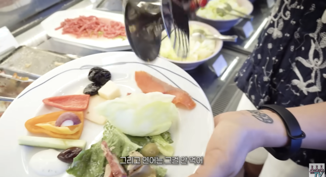 그는 조식 먹는 요령에 대해 "조금만 담는다. 그리고 사람들이 뭘 많이 퍼는지를 보는 거다"라고 설명했다. 첫 접시는 야채 위주, 2번째 접시는 단백질 위주로, 이날 한혜연은 스테이크를 먹으며 감탄했다. "관리의 신 빗장 푸시나?"라는 질문에 한혜연은 "오늘하고 내일만 먹자"라고 대답했다.