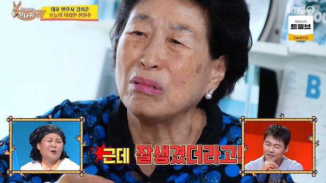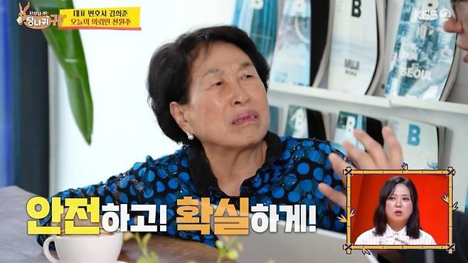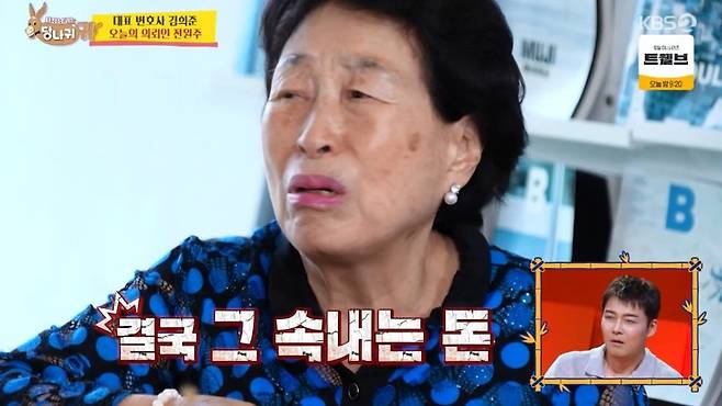 이날 김 변호사를 찾은 의뢰인은 전원주다. 음료를 대접하겠다는 김 변호사에 전원주는 대뜸 "돈 아껴라"라고 일침을 날리는 것으로 구두쇠 면면을 뽐냈다. 이어 "난 카페에 가도 둘이 가서 커피 한 잔만 시켜 나눠 마신다. 그렇게 티끌 모아 태산을 만든 것"이라고 강조했다.