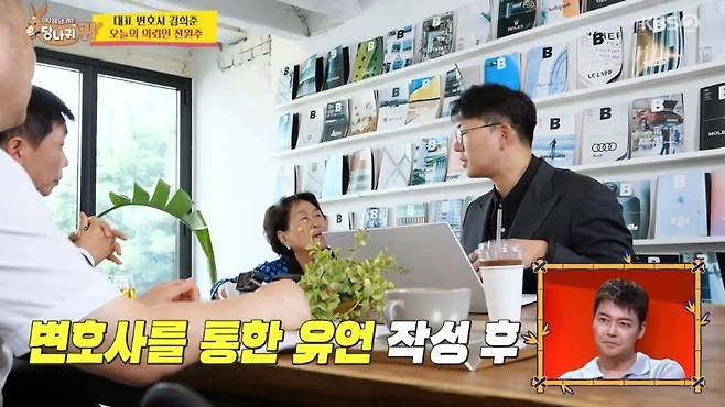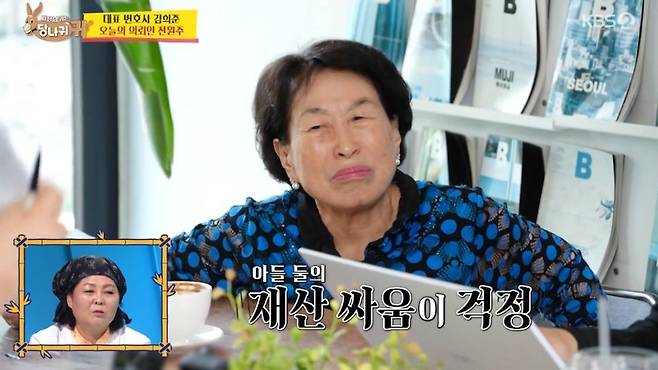 나아가 "내가 떠나면 아들 둘이 재산을 갖고 싸울까 걱정"이라며 고민을 토로했다. 이에 김 변호사는 사전에 변호사를 통해 유언장을 작성하는 게 핵심이라며 "지금처럼 생활하면 돈이 없어질 일은 없을 것"이라고 조언했다.