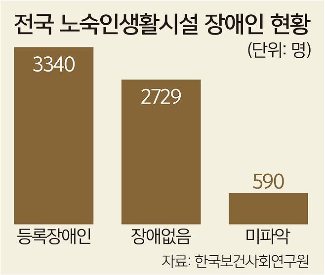 전국 노숙인생활시설 입소자 중 절반은 장애인이다. 한국보건사회연구원의 ‘노숙인 등의 실태조사’에 따르면 생활시설 노숙인 6659명 중 3340명(50.2%)이 장애인인 것으로 조사됐다. 노숙인재활시설의 장애인 비율은 53.8%, 노숙인요양시설은 64.4%까지 오르는 등 주거 기능이 커질수록 장애인 비율도 높아졌다.