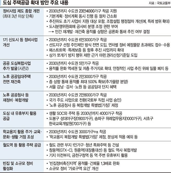 서울 서초구 한국교육개발원(700가구) 및 학교·철도용지 등 유휴부지 개발부터 1기 신도시 주민제안 방식 전면 도입, 재개발·재건축 사업기간 3년 이상 단축, 노후 공공임대 전면 재건축, 공공 도심복합사업 신규 발굴 등 그간 논의 및 거론됐던 방안이 다수 포함됐다.