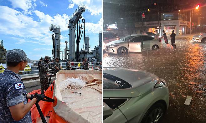 | 한쪽은 극한 가뭄… 다른 한쪽은 극한 호우… 한반도에서 ‘극한 가뭄’과 ‘극한 호우’가 공존하는 이른바 ‘기후 양극화’ 현상이 일상화하고 있다. 왼쪽 사진은 가뭄에 따른 국가 재난사태 선포 8일째인 6일 강원 강릉시 안인항 화력발전소 하역부두에서 해군 소속 군수지원함 대청함 승조원들이 이동식 저수조에 45만ℓ의 물을 지원하는 장면이며, 오른쪽 사진은 같은 날 시간당 152㎜의 폭우가 쏟아진 전북 군산시에서 갑자기 불어난 물로 도로가 침수된 모습이다. 해군 제공, 군산=뉴스1 |