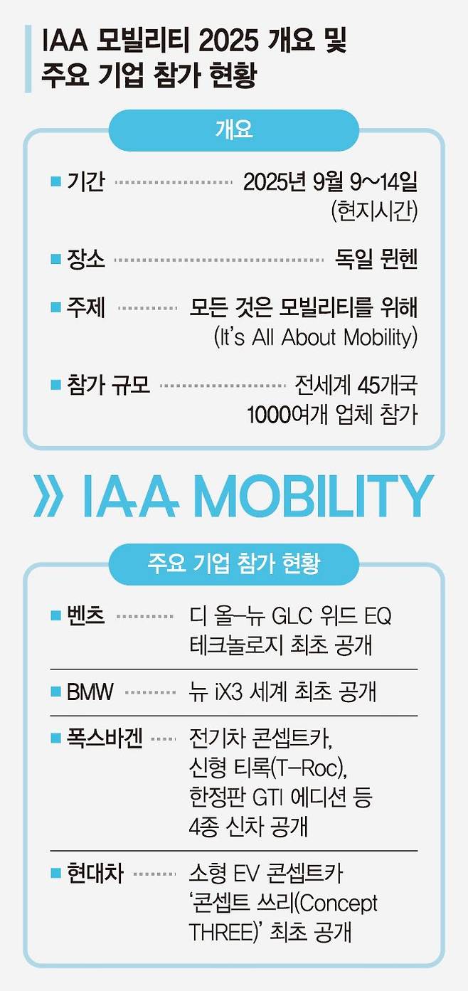 오는 9일(현지시간)부터 독일 뮌헨에서 열리는 유럽 최대 규모의 모빌리티 쇼 'IAA 모빌리티 2025'는 메르세데스-벤츠, BMW, 폭스바겐그룹 등의 신형 전기차 격전지가 될 것으로 보인다.