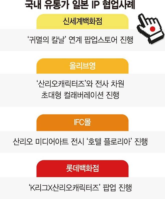 유통업계는 일본 IP를 활용한 집객 전략에 적극 나서고 있다. 올 여름 올리브영은 '산리오'와 손잡고 매장 전체를 태닝한 헬로키티 캐릭터로 꾸미고 협업 상품을 선보이는 등 MZ세대 공략에 나섰다. 산리오 캐릭터즈 태닝 에디션은 32개 브랜드에서 200여종이 출시됐고, 협업 기간(7월) 동안 10대 고객 매출은 전년 동기 대비 60% 증가했다. '트렌드팟 바이 올리브영홍대'에서 3주 간 진행한 산리오 팝업스토어에는 3만3000명이 방문하며 역대 최다 방문객을 기록했다.